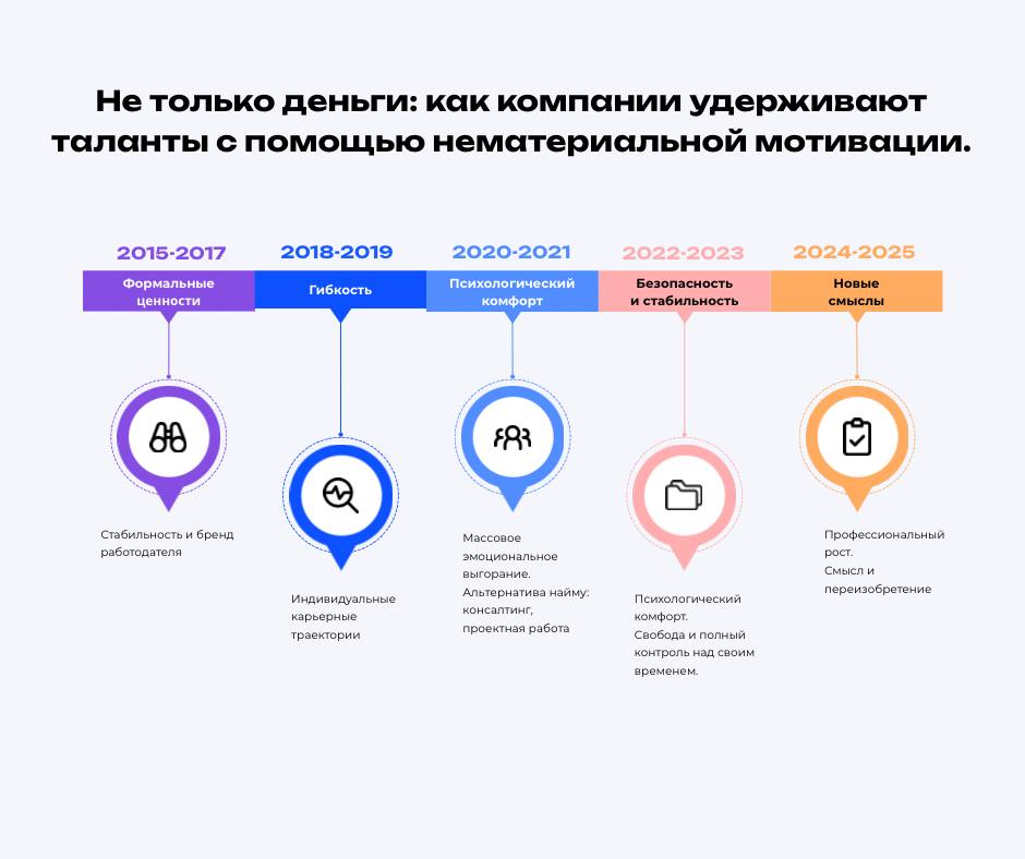 - 2015–2017: Статус и бренд. Главное — престижная компания и строчка в резюме. Баланс «работа‑жизнь» сводился к формальным инициативам вроде корпоративной йоги.
